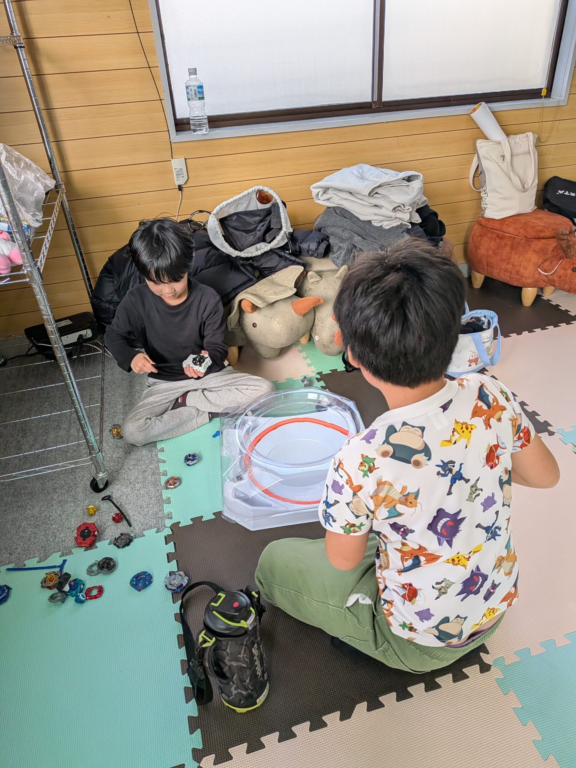今日は「ベイブレード組」と「おもしろ体力測定」の二手に分かれて、遊びました。