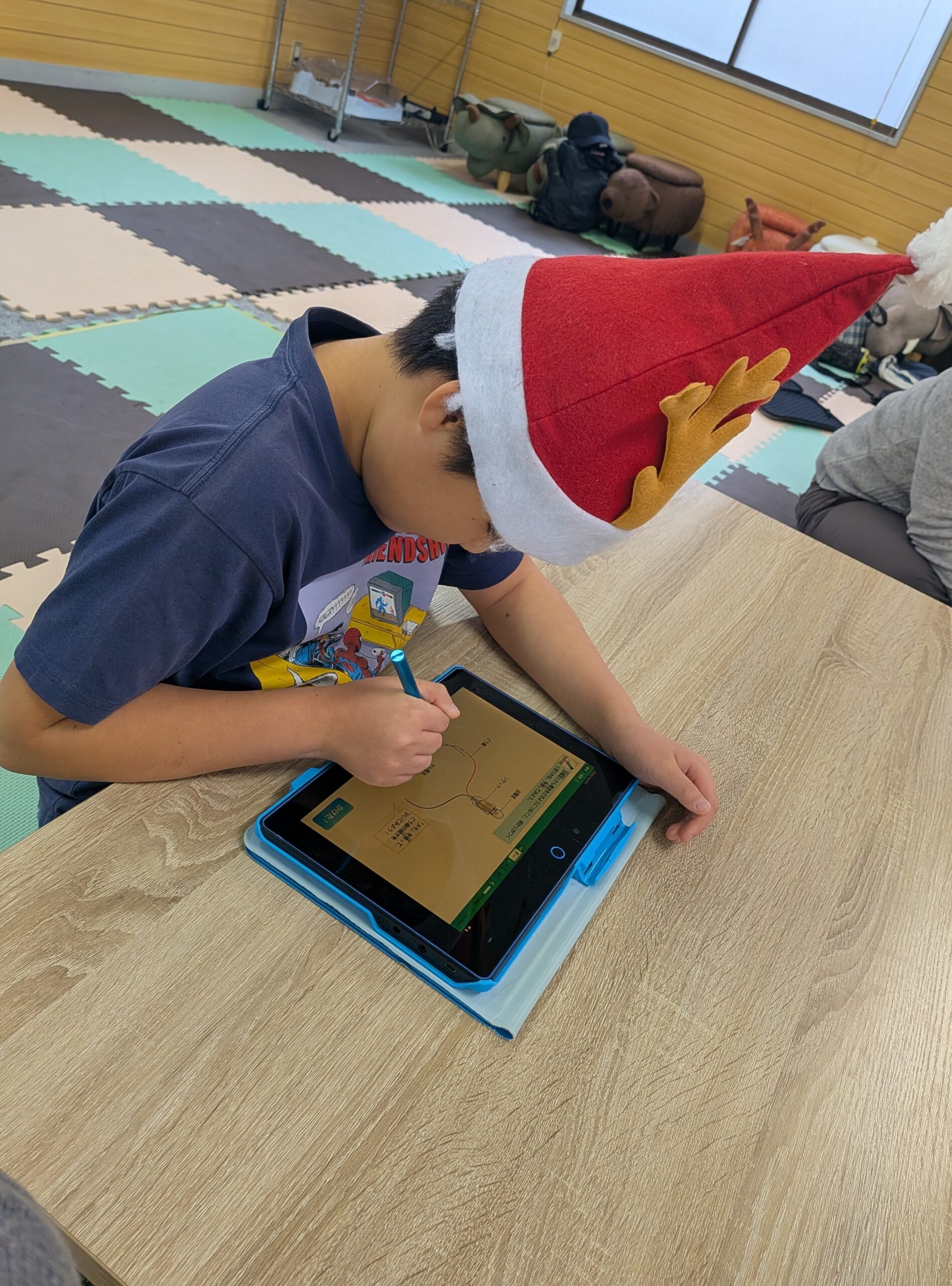 サンタ帽を被っても、タブレットでサクサクと理科の勉強。